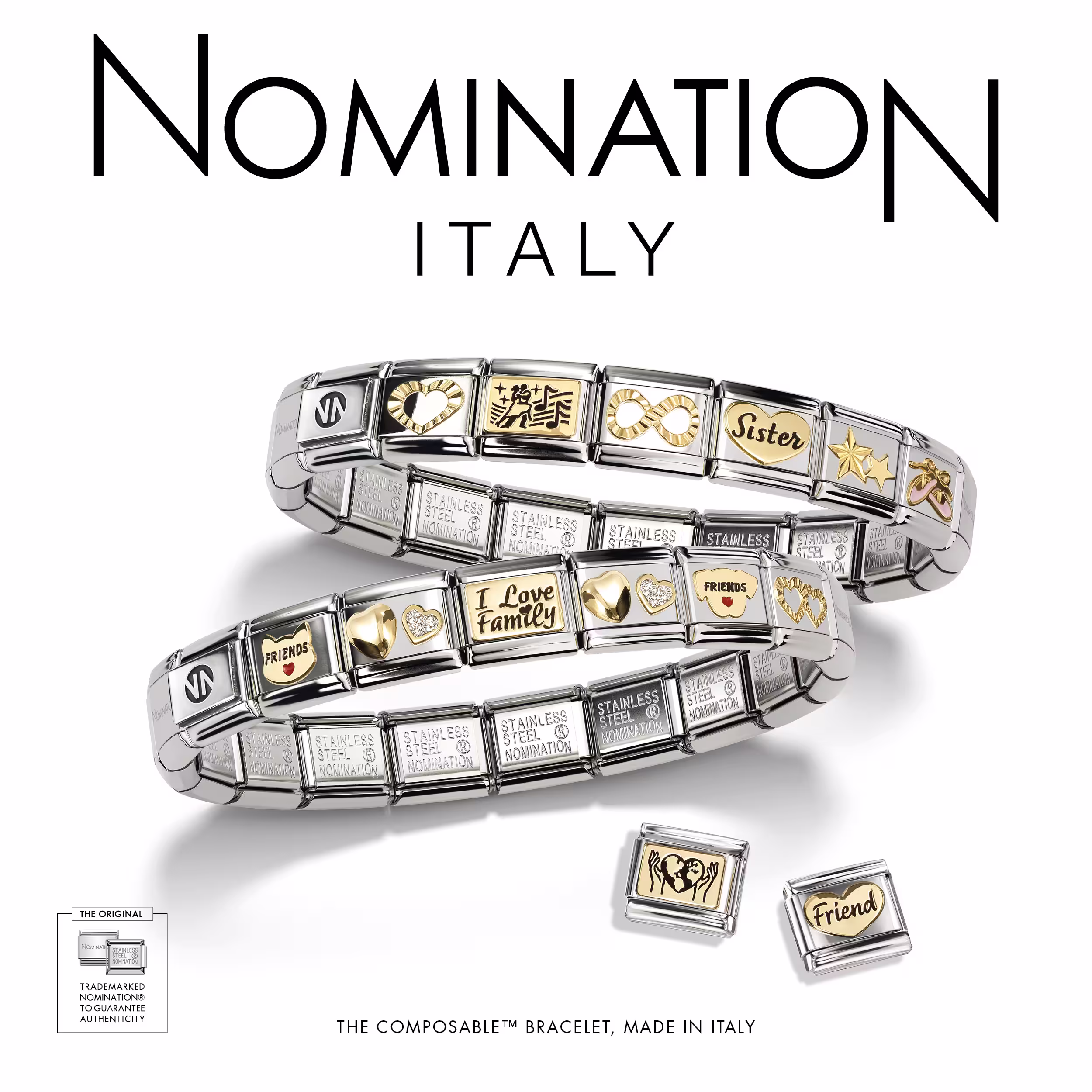 The Composable bracelets are a timeless gift, suitable for any occasion. These are unisex and genderless pieces of jewellery featured by a classic steel or golden base and different decorations.