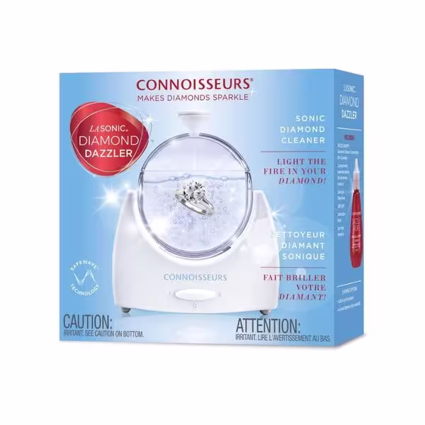 The LaSonic Compact Cordless Diamond Dazzler Jewellery Cleaning Bath is the state-of-the-art, DIY sonic cleaner for cleaning jewellery at home, brought to you by the watch and jewellery cleaning experts at Connoisseurs. La Sonic features a clear cleaning tank with carousel and suspension hooks for hands-free jewellery cleaning and includes a bottle of Dazzle Drops Jewellery Cleaning Solution. This diamond cleaner offers the convenience of both battery and USB power options, delivering professional-quality results at home. Ideal for cleaning earrings, necklaces, bracelets, and other jewellery, it works effectively on gold, platinum, diamonds, and both precious and semi-precious gemstones.