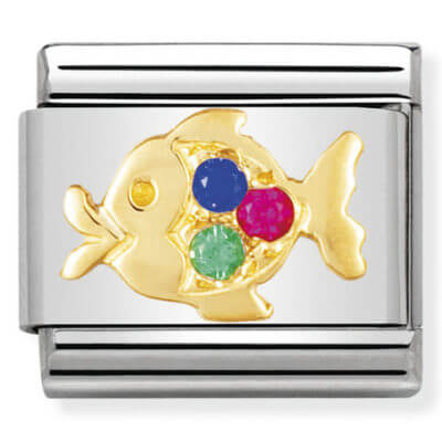 Classic Charm for Original Composable Bracelet with Fish symbol in stainless steel, 18K gold and Cubic Zirconia. Made in Italy. Also available in other Nature- and Animal-themed symbols.