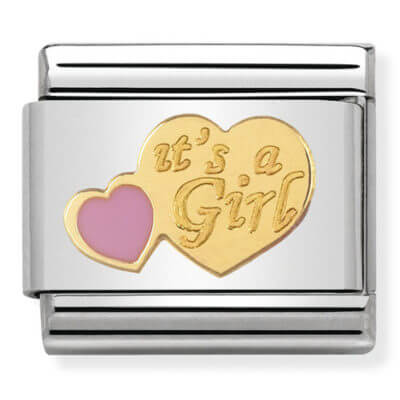 Charm in stainless steel for the Original Classic Composable bracelet with “It’s a Girl” and a pink Heart in 18K gold and enamel. Made in Italy. Celebrate this wonderful news with a new Charm!