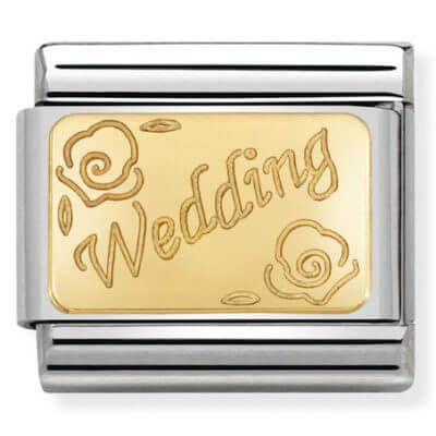 Charm for the Original Composable Classic bracelet with “Wedding” and Floral symbols engraved in stainless steel and 18K gold. Made in Italy. Each wedding is special and unforgettable. Remember it always with our new Charm from the Composable Collection.
