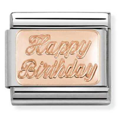 Original Charm for Nomination’s Composable Classic Bracelet in stainless steel and 9K rose gold with gold plate with “Happy Birthday” writing. Made in Italy. Say “Happy Birthday” in a special way!