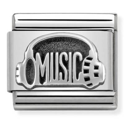 Original Charm for Nomination’s Composable Classic bracelet in stainless steel with Headphones and “MUSIC” in oxidised sterling silver. Made in Italy. The perfect gift for a major music fan.