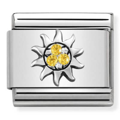 Original Charm for Nomination’s Composable Classic bracelet in stainless steel, sterling silver and yellow Cubic Zirconia with a Sun symbol. Made in Italy. Do you love the summer sun? Then this is the Charm for you.