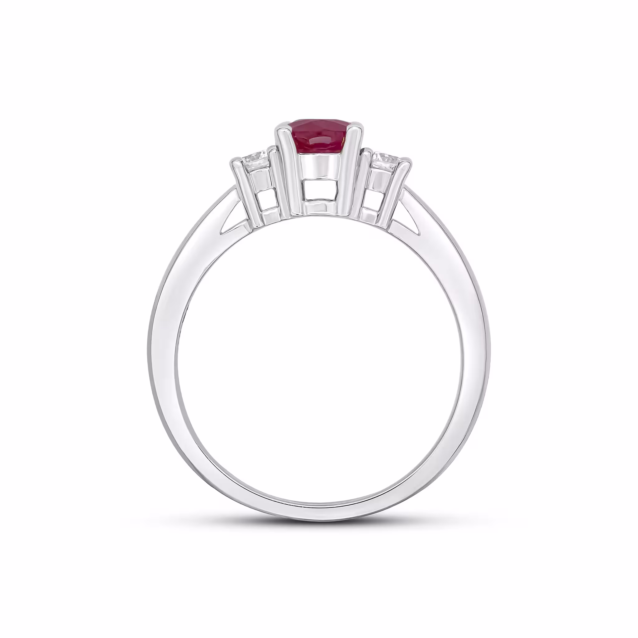 9CT White Gold Oval Ruby & Round Diamond Claw Set Three Stone Ring