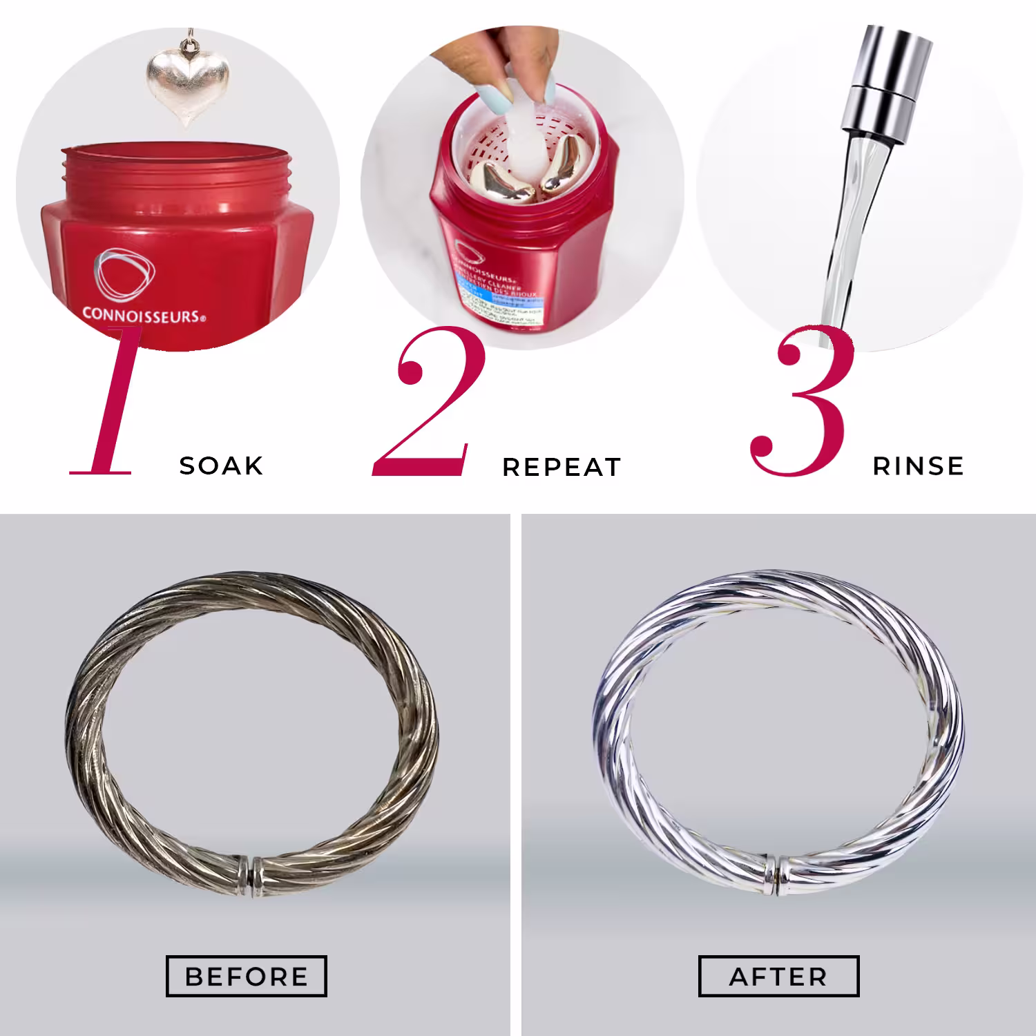 Use Silver Jewellery Cleaner only on .925 sterling silver. For silver plate, use Connoisseurs Dazzle Drops Silver Creme, Connoisseurs Silver Jewellery Polishing Cloth, or Connoisseurs Jewellery Wipes. Do not use on silver with stones or oxidized/antiqued silver.